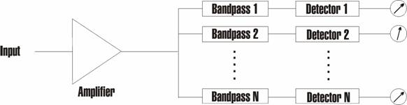更迅速更準(zhǔn)確的方發(fā)是運(yùn)用一系列濾波器,把這些濾波器并連起來(lái),每一個(gè)濾波器均有一個(gè)獨(dú)一無(wú)二的中心頻率,每一個(gè)濾波器各自與其偵測(cè)儀器相連。