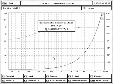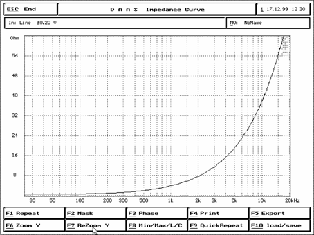 欲同時(shí)顯示頻響曲線與阻抗曲線,首先執(zhí)行阻抗測(cè)試,調(diào)整Y軸顯示范圍。然后回到主菜單,移去阻抗測(cè)試線,開(kāi)始執(zhí)行頻響測(cè)試,此一步驟完成后,在頻響菜單[F10]內(nèi)選擇[F5],重新直接執(zhí)行阻抗測(cè)試(無(wú)需再作阻抗基準(zhǔn)測(cè)試)。此時(shí),阻抗曲線與頻響曲線同時(shí)顯示于同一畫(huà)面上。