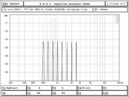 當(dāng)選用適當(dāng)?shù)闹行念l率,而使一系列并連濾波器之頻帶恰好密切接合之際,即可獲得完整之頻譜。如此只要利用DAAS執(zhí)行兩次測(cè)試,即可得到完整的頻率響應(yīng)曲線。