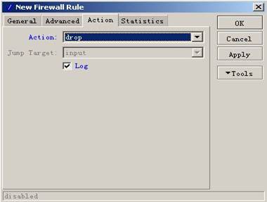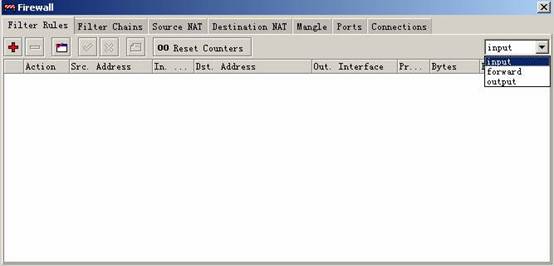 在 ip –firewall ---Filter rule 中,有intup (入口) forward (轉(zhuǎn)發(fā)) output (出口),網(wǎng)吧一般設(shè)置input 和forward就可以了