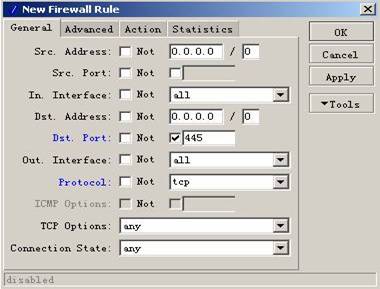 比如封掉445端口,協(xié)議tcp 和udp 都要做,input 和forward 都要做,action 選drop 就是丟棄