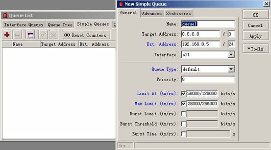 限制下載速度在queues –simple queue ,比如限制ip 為192.168.0.5的機(jī)器的下載速度為128k-256k 上傳為56k-128k